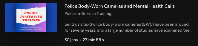 Phillips, Scott. (2026, January 30th). Police Body-Worn Cameras and Mental Health Calls. Police In-Service Training Podcast. Entrevue avec Dr. Vincent Mousseau, à propos de notre article.