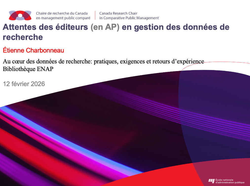 Charbonneau, Étienne. (2026, 12 février). Attentes des éditeurs (en AP) en gestion des données de recherche. Présentation pour l’évènement ‘Au cœur des données de recherche: pratiques, exigences et retours d’expérience.’ Montréal, QC : École nationale d’administration publique.